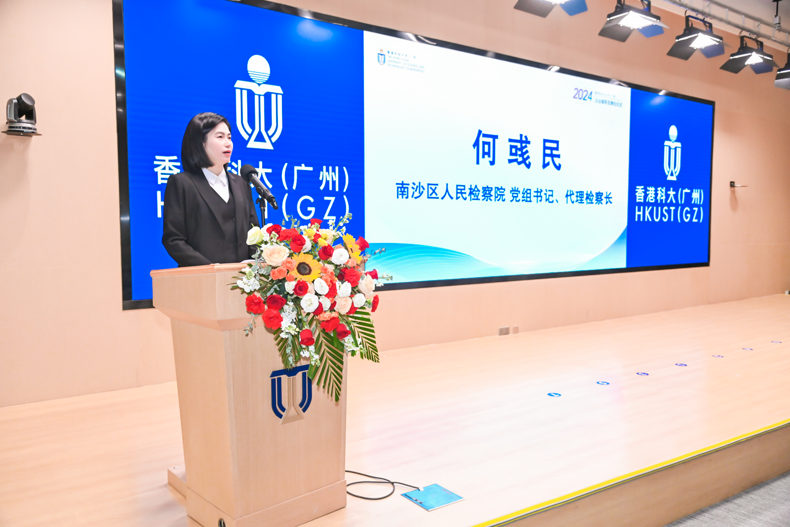致辞环节,何检重点围绕如何更好履行“法治辅导员”职责,提供更加优质的检察服务、普法产品与港科广师生分享交流,并提出三点建议。